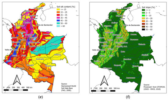 The soil clay content distribution map (Figure 2d) illustrates variations in clay content throughout the country [38]. Soils with higher clay percentages are found in the Andean regions and some parts of the Caribbean coast, contributing to their fertility and water retention capabilities. Areas with lower clay content are observed in the drier regions of the northern coast and eastern plains. The soil silt content distribution map (Figure 2e) reveals the prevalence of silt in many regions of Colombia [38]. Silt-rich soils can be found in the river valleys, floodplains, and deltas, particularly along major rivers such as the Magdalena and Cauca. These areas often exhibit fertile soils suitable for agriculture. The slope distribution map (Figure 2f) reflects the diverse topography of Colombia, with a range of slope percentages observed across the country [35]. Steep slopes are predominant in the mountainous regions, particularly in the Andes, while flatter terrains are present in the coastal plains and some lowland areas.