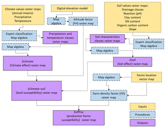 In this study, the susceptibility of the land will be evaluated, understood as the degree to which environmental conditions (climate, soil, and altitude) potentially predispose areas for infection with Foc TR4 together with the susceptibility of the production farms, understood as the degree in that both the environmental conditions together with the location (spatial density) of the banana and plantain production farms condition the possibility of infection. The methodological scheme for the determination of the susceptibility index of the farm’s production to the Foc TR4 (SUPFoc) is shown in Figure 3.