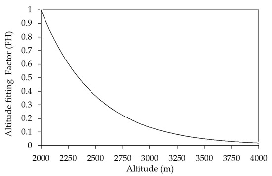 The fit factor FH was obtained as a function of altitude (h). Above 2000 m, this function gradually reduces the value of FH and, consequently, the previous result of the product of Equation (5). In this way, from 2000 m, the altitude adjustment factor decreases asymptotically as the altitude approaches infinity.
