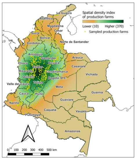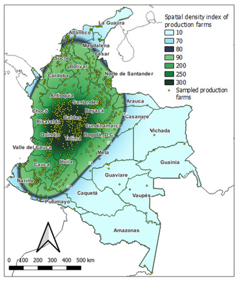 Once all the points over the territory of continental Colombia were obtained, a density raster map was generated considering a radius of 3° geographic from each point. The system, for each point, determines the density of the points included within that radius. Then, there is an interpolation between the density values obtained through the various circles. The result is distributed, continuously, with higher values in the areas with a higher concentration of points or farms and lower values in the areas with a lower concentration.