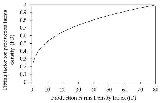 Figure 6 shows the curve that represents the function used. Consequently, to the extent that in each pixel the density of production farms is lower, the value of EClimate–soil is reduced. The use of a potential type of function allows the value of the adjustment factor, below a certain density index threshold (in this case, 80), to be asymptotically reduced to zero as the density index approaches zero.