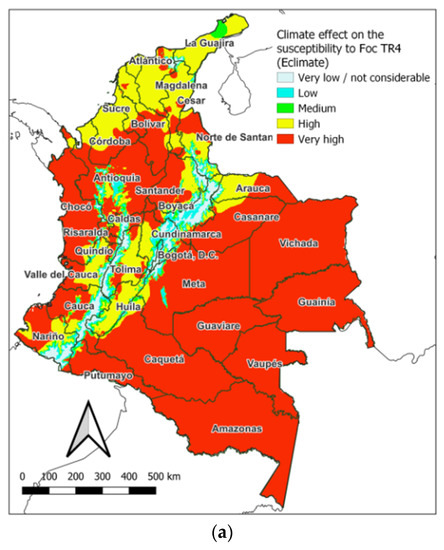 The climate turned out to be a very important predisposing factor for infection with Foc TR4 in almost the entire territory of Colombia (Figure 7a). It was estimated that 91.5% of the surface qualifies as highly and very highly susceptible due to the effect of precipitation and temperature. Only a smaller fraction (8.5%) resulted in average and lower ratings. It is worth noting that, if only the effect of precipitation and temperature is considered, in Colombia, the entire territory would correspond to medium to very high classes. The low and not considerable classes result from the effect of altitude as a factor that adds the particular conditions of climate, access, and relief and that dominates over the effect of precipitation. In this case, the lands that, due to the effect of the climate, are classified as low and less susceptible correspond to 6.4%.