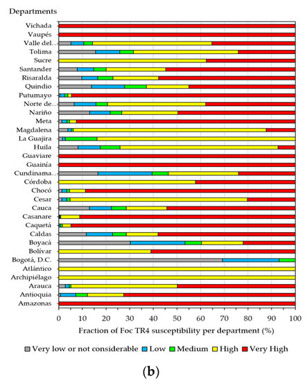The departments with the greatest susceptibility of the lands to infection with Foc TR4 for climatic reasons were Amazonas, Guainía, Guaviare, Vaupés, and Vichada, all of them with 100% of their surface with very high susceptibility. It is followed by the departments of Caquetá, Casanare, Putumayo, Meta, Chocó, Bolívar, and Antioquia, with more than 60% of their surfaces with very high susceptibility. The departments with the least susceptibility due to the effect of climate were Bogotá D.C, Boyacá, and Cundinamarca, with more than 40% of their surface with susceptibility between very low and medium. The rest of the departments presented high and very high susceptibility in at least 85% of their surface (Figure 7b).