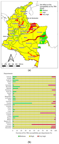 The departments with the highest proportion of soils with very high susceptibility to infection with Foc TR4 are Arauca and Casanare, with more than 35% in proportion to the area of each one. The department of Guainía stands out with a high proportion of soils that confer medium susceptibility to infection (45%). Most of the departments have medium susceptibility soils of around 5% and up to 16%. Likewise, in most departments, the surface occupied by soils that confer high susceptibility to infection with Foc TR4 is greater than 80% (Figure 8b).