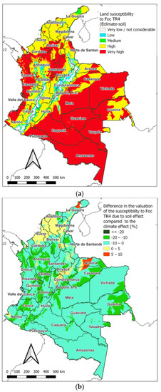 (a) Assessment of the susceptibility of Colombian lands to infection with Foc TR4 due to the joint effect of climate and soil (Sclimate–soil); (b) Differences in the assessment of the susceptibility of lands to infection by Foc TR4 due to the effect of the soil (Sclimate–soil) compared to the assessment conferred by the climate alone (Eclimate).