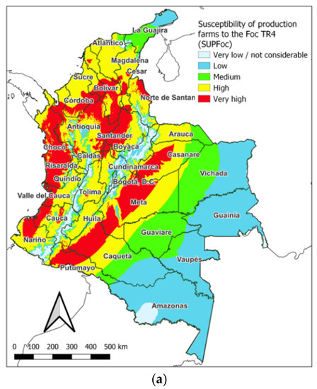 When considering the density of Musaceae (banana and plantain) production farms, it is obtained that the high and very high susceptibility classes occupy around 50% of the continental Colombian territory (572,000 km2). This is because as one moves towards the east, the density index of production farms decreases substantially given the dispersion and very low number of these (Figure 11a). In these areas, although the susceptibility for environmental reasons (land susceptibility) may be very high, the very low occupation by Musaceae production farms means that the possibility of infection may be low. As a consequence, in general, the lower and middle classes increase their proportion (29.3 and 16.4%) at the expense of the more susceptible classes. The very low or not considerable class maintains a very low proportion, corresponding to lands that due to their altitude (and associated factors such as access and temperature) are not suitable for production systems in low-lying areas and also “remote lands” with a very low density of production farms (as in the department of Amazonas).