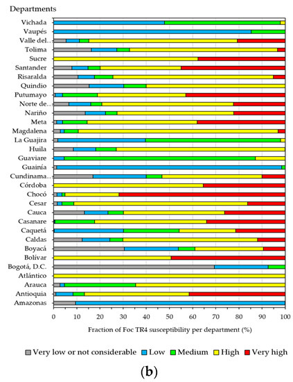 Regarding the proportions of the susceptibility classes of the production farms to infection with Foc TR4 by department (Figure 11b), only nine of them presented less than 50% of high and very high susceptibility classes of the production farms (Vichada, Vaupés, La Guajira, Guaviare, Guainía, Caquetá, Boyacá, Bogotá D.C, and Amazonas), while the departments of Antioquia, Atlántico, Bolívar, César, Chocó, Córdoba, Magdalena, Meta, and Sucre presented more than 85% of their surface with high (and very high) susceptibility of the production farms. In addition, Antioquia, Bolívar, Chocó, and Santander turned out to be the departments with the highest proportion of very high-class susceptibility of the production farms.