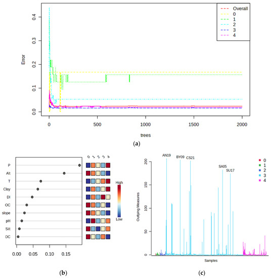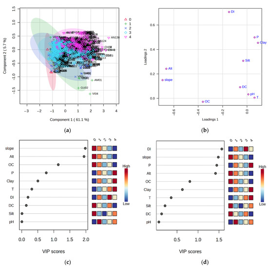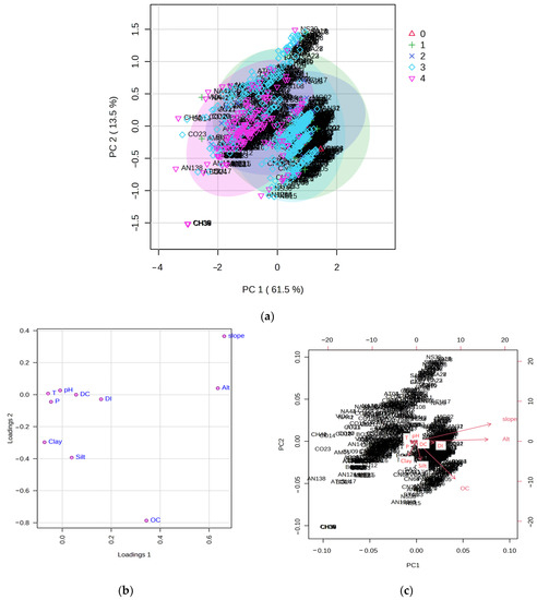 Using PCA, the susceptibility classes were not distinguishable (Figure 12a). The first two principal components (PC) explained 75.0% of the variance; however, no trends in differences were detected (Figure 12c). Based on the contribution value |loading values| > 0.30, we obtained the top five variables, including slope (0.66), altitude (0.63), and OC (0.34) in the first component and the silt (0.39) and clay (0.30) in the second component (Figure 12b).