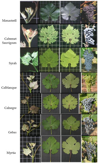 The young shoot, upper and lower side of the mature leaf, and bunch of ‘Monastrell’, ‘Cabernet Sauvignon’, ‘Syrah’, ‘Calblanque’, ‘Calnegre’, ‘Gebas’ and ‘Myrtia’. Images obtained from the website of the Spanish Ministry of Agriculture, Fisheries and Food (https://www.mapa.gob.es/ (accessed on 28 March 2022)).