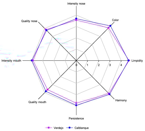 As can be observed in Figure 2, ‘Calblanque’ wine was compared to ‘Verdejo’ wine due to both being white varieties, and in addition, ‘Verdejo’ is considered a high quality wine among white wines in Spain. Among the descriptive attributes taken into account, color, mouth and aroma characteristics were evaluated. Although the difference was small between both wines, the tasters were able to distinguish them sensorially, giving them different scores. With regard color, ‘Calblanque’ wines showed a higher value in comparison to ‘Verdejo’ wines. Regarding nose attributes, intensity was higher in ‘Calblanque’ wines than in ‘Verdejo’ wines; however, the quality was superior in the latter in comparison with ‘Calblanque’. Intensity, quality and persistence in mouth were higher in ‘Calblanque’ than ‘Verdejo’ wines. Finally, harmony, a parameter that alludes to the global perception of the wine, also scored higher in ‘Calblanque’ wines. Moreno-Olivares et al. (2020) [59], in a study carried out with different white crossbreeds from ‘Monastrell’, showed results that highlighted how the crosses MT103, MC69 and MC180 (‘Calblanque’) showed significant differences from and better quality than the ‘Verdejo’ wine.