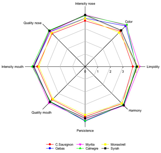 The quality and phenolic characteristics of our wines from the new varieties were promising, but we wanted to check if they also had that quality sensorial characteristic, so we carried out a descriptive sensory analysis. The technique of descriptive analysis (DA) provides a quantitative analytical characterization of appearance, aroma, taste and mouthfeel as described in detail elsewhere [57,58].
