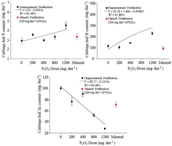 Cabbage leaf P, Zn, and B content as a function of P2O5 doses applied via organomineral fertilizers.