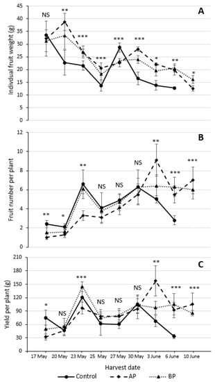 Individual fruit weight (A), fruit number per plant (B), and yield per plant (C) at individual treatments (control, AP: after planting, and BP: before planting) and harvest dates. Data are means ± standard errors of 15 plants per treatment at individual harvest date. Significant differences among treatments within the same harvest date were estimated using LSD and t-test at p < 0.05; * p < 0.05; ** p < 0.01; *** p < 0.001; NS, non-significant; -, no data.