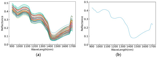 After the spectrum was acquired, original spectral curves (Figure 2a) and average spectral curves (Figure 2b) were obtained. Overall, the original spectral curves reflected similarity in the reflectance spectral data of all samples, with small differences from sample to sample, indicating that the mineral content in the samples was generally similar. The reflectance spectral data reached the maximum and minimum values at wavelengths of approximately 900 nm and 1450 nm, respectively, and there were obvious curve troughs near 980 nm, 1200 nm, 1440 nm, and 1660 nm and obvious peaks at 1050 nm, 1260 nm, and 1680 nm, which may be related to compounds in pear fruit [33,34]. The primary peaks of water absorption, according to the literature, are 980 nm and 1450 nm. About 1660 nm corresponds to the first frequency-doubling information of the methyl C-H bond tensile vibration about related carbohydrate O-H bonds. The main chemical components in pear fruit include flavonoids, triterpenes, phenolic acids, luminolates, and polysaccharides [35,36]. The entire spectral curve is a rich reflection of the pear fruit’s interior data.