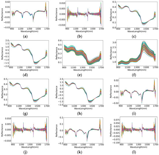 Spectral curves after different pretreatments: (a) FD, (b) SD, (c) MSC, (d) SNV, (e) SG, (f) LG, (g) SG + MSC, (h) SG + SNV, (i) SG + MSC + FD, (j) SG + MSC + SD, (k) SG + SNV + FD, and (l) SG + SNV + SD.