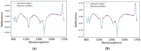 Location distribution of characteristic wavelength extraction points of the iron content prediction model for pear pulp: (a) SG + MSC + FD-GA-PLSR and (b) SG + SNV + FD-GA-PLSR.