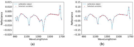 According to the figure, the extracted spectral points had no obvious regular distribution on the original spectral curve, but most of them were concentrated between 920 and 1100 nm, 1150 and 1300 nm, and 1450 and 1650 nm. Although the characteristic wavelength points extracted by the two spectra were different, most of them were concentrated in these three regions, indicating that these wavelength intervals can reflect most of the spectral information.
