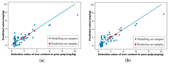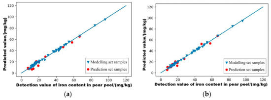 Model prediction of the iron content in pear pulp samples (scatter plot): (a) SG + MSC + FD-GA-PLSR and (b) SG + SNV + FD-GA-PLSR.
