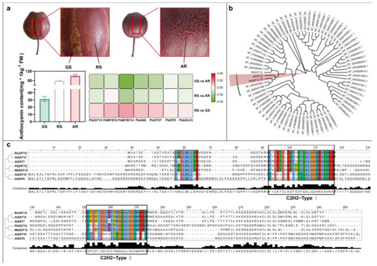 Phylogenetic Analysis of Pear Genes from Different Plant Species. (a) RS, GS, and AR phenotypes of ‘Red Zaosu’ pear; anthocyanin content of PbZAT12; and log2.Fold_change values of anthocyanin-biosynthesis-related genes in the transcriptome (RS: Red stripes peel of ‘Red Zaosu’; GS: Green stripes peel of ‘Red Zaosu’; AR: Peel of all-red ‘Red Zaosu’). (b) Phylogenetic analysis of MdZAT12 and AtZAT12 in pear, apple, and Arabidopsis. The five-pointed stars represent PbZAT12, the red shaded areas represent the closest homologous genes to PbZAT12, and the green outlined areas represent multiple homologous genes clustered together with PbZAT12 in the phylogenetic tree. (c) Phylogenetic analysis of ZAT proteins in different plants and multiple sequence alignment of different ZAT proteins. The accession numbers of the proteins obtained from NCBI are listed in Supplementary Table S2. The C2H2 conserved domain is highlighted with a box in (c). Note: We named XP_009337587.1 as PbZAT12.