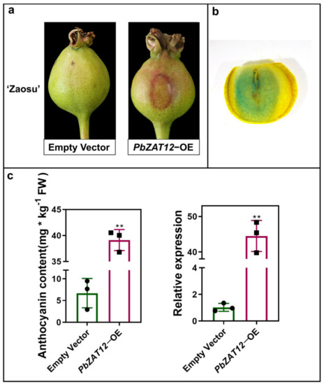 To investigate whether the expression of PbZAT12 affects anthocyanin accumulation, we performed transient expression of PbZAT12-OE constructs on pear fruitlet peels using agrobacterium infiltration. Our results showed that compared to fruitlets injected with an empty vector, fruitlets with PbZAT12-OE constructs had significantly higher levels of anthocyanin accumulation on their peels (Figure 2a). To confirm successful infection on the fruitlet peels, we monitored the GUS signals (Figure 2b). Moreover, the expression level of PbZAT12 was significantly increased in the peel of PbZAT12-OE ‘Zaosu’ fruitlets (Figure 2c). These findings suggest that PbZAT12 plays a role in promoting anthocyanin accumulation in the skin of pear fruitlets.