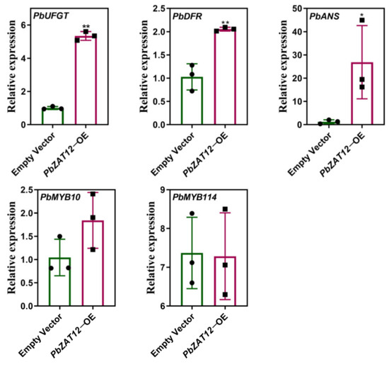 To identify potential downstream genes regulated by PbZAT12, we performed real-time PCR analysis of structural genes and transcription factors involved in anthocyanin biosynthesis in the peel of PbZAT12-OE pear fruitlets. The findings revealed a substantial increase in the expression levels of PbDFR, PbANS, and PbUFGT in the peel of PbZAT12-OE fruitlets compared to those injected with an empty vector (Figure 3). These findings suggest that PbZAT12 promotes anthocyanin accumulation in the peel of pear fruitlets by regulating the expression of genes involved in anthocyanin biosynthesis.
