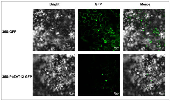 According to Uniprot (http://www.uniprot.org/, accessed on 23 August 2022), the subcellular localization prediction suggests that AtZAT12 is predominantly localized in the nucleus. To determine the localization of PbZAT12, localization analyses were performed using transient assays in Nicotiana benthamiana leaf cells. The results revealed that the GFP fluorescence of 35S: PbZAT12-GFP was localized to the nucleus of Nicotiana benthamiana leaf cells (Figure 4), indicating that PbZAT12 is also a nuclear protein. In contrast, the positive control 35S: GFP exhibited GFP fluorescence in both the cytomembrane and nucleus of Nicotiana benthamiana leaf cells (Figure 4).