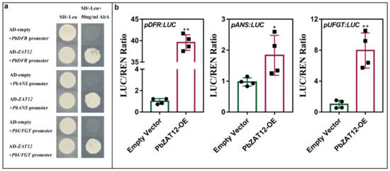 To confirm the impact of PbZAT12 on the promoters of anthocyanin synthesis structural genes, we performed both a Y1H assay and dual-luciferase analysis. The Y1H assay revealed that PbZAT12 was capable of directly binding to the promoters of PbDFR, PbANS, and PbUFGT (Figure 5a). We then analyzed the activation of PbZAT12 on the promoters of anthocyanin-related structural genes in leaves of Nicotiana benthamiana. Co-infiltration of PbZAT12 with PbDFR, PbANS, or PbUFGT in Nicotiana benthamiana leaves resulted in a significant increase in luciferase activities compared to the control group (Figure 5b), indicating that PbZAT12 is capable of both binding directly and activating proPbDFR, proPbANS, and proPbUFGT.