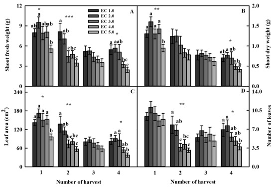 Shoot fresh weight (A), shoot dry weight (B), leaf area (C), and number of leaves (D) of coastal glehnia grown in Hoagland nutrient solution with five different EC levels for 20 weeks after transplanting and with four consecutive harvests. Different letters in the figures indicate significant differences. *, **, and *** indicate significance at p < 0.05, 0.01, and 0.001, respectively (n = 11).