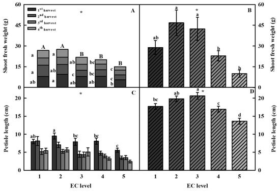 Shoot fresh weight and petiole length of coastal glehnia grown in Hoagland nutrient solution with five different EC levels for 20 weeks and with four consecutive harvests (A,C) and a single harvest (B,D) at 20 weeks after transplanting. Different letters in the figures indicate significant differences. *, indicates significance at p < 0.05 (n = 11).