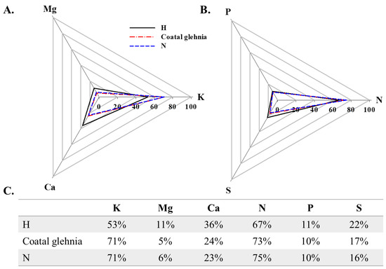 Mutual ratios of cation (A) and anion (B) macronutrient compositions (C) of Hoagland nutrient solution (H), coastal glehnia, and newly developed nutrient solution for coastal glehnia (N).