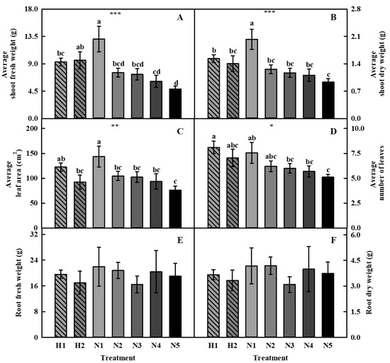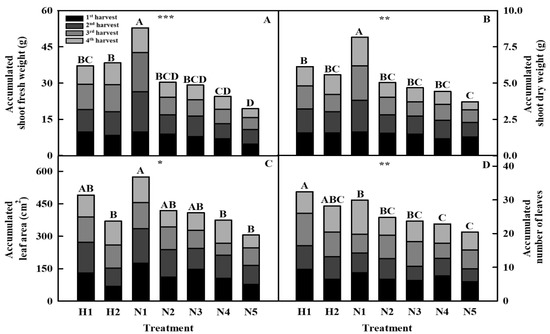 N1 had the highest accumulated shoot fresh and dry weights among the treatments (Figure 4A,B). In addition, plants grown in N1 had the highest accumulated leaf area, which was significantly higher than that of plants grown in the H2, N4, and N5 treatments (Figure 4C). The accumulated number of leaves in H1 was significantly higher and there was no difference among H2, N1, N2, and N3 (Figure 4D).