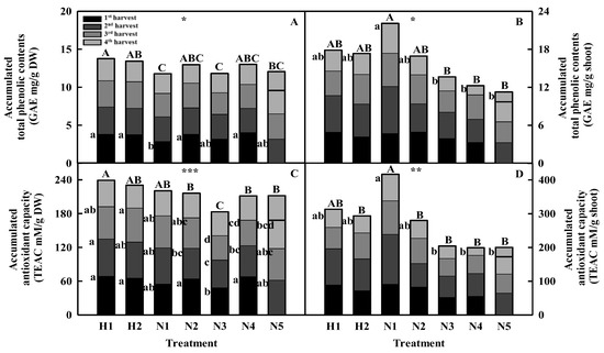 Accumulated total phenolic content (A,B) and antioxidant capacity (C,D) of coastal glehnia in plants grown in Hoagland nutrient solution with various EC levels and newly developed nutrient solution for 23 weeks after transplanting and with four consecutive harvests. Different letters in the figures indicate significant differences. *, **, and *** indicate significance at p < 0.05, 0.01, and 0.001, respectively (n = 5).