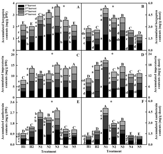 The developed nutrient solution treatments improved the xanthotoxin, bergapten, and imperatorin content in coastal glehnia leaves (Figure 7). After the four harvests, the accumulated bergapten and xanthotoxin content per gram of coastal glehnia shoots was significantly higher in the N1, N2, and N3 treatments than in the H1, H2, N4, and N5 treatments (Figure 7A,E). The imperatorin content per gram in H2, N3, N4, and N5 was significantly higher than in H1, N1, and N2 (Figure 7C). Plants grown in H1 showed a significantly low value for the three individual compounds. The accumulated levels of bergapten, imperatorin, and xanthotoxin per shoot in N1 were 4.2 times, 1.9 times, and 2 times higher than those in H1, respectively, and were significantly higher than the other treatments (Figure 7B,D,F). Generally, as the harvest progressed, the content per shoot of each compound decreased.