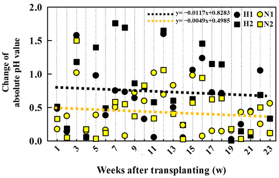 Change in absolute pH value of Hoagland (H1 and H2; black dot line) and newly developed (N1 and N2; yellow dot line) nutrient solutions during 23 weeks after transplanting (n = 4).