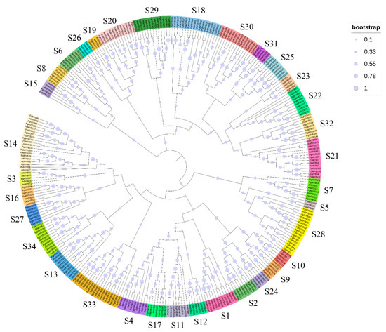 The Arabidopsis MYB family had been studied deeply, and many MYB functions had been verified. Therefore, researchers can infer the function of the same subgroup of genes from the phylogenetic tree. This study constructed phylogenetic trees with the R2R3-MYB gene families of Arabidopsis thaliana and pomegranate (Figure 1). In Dubos’s study, the Arabidopsis R2R3-MYB gene family was divided into 25 subgroups [18]. The study referred to his classification result and divided the R2R3-MYB gene family of pomegranate into 34 subgroups, ensuring that each MYBs were classified. There are 31 subgroups of PgMYBs and AtMYBs, but a few members fail to cluster with AtMYBs. These branches that do not contain AtMYB are S26, S27, S28, and S32. The constructed phylogenetic tree not only facilitates the exploration of phylogenetic relationships within the PgMYB family but also enables identification of lignin-related PgMYBs, given that numerous AtMYB genes have been functionally characterized.