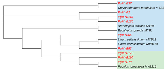 Phylogenetic analysis of Lignin-related PgMYB. The pomegranate MYB genes are highlighted in red.