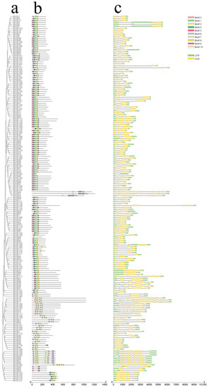 The gene structures and protein domains of PgMYB members, (a): phylogenetic tree of PgMYBs; (b): Protein motif of PgMYBs, they were named according to the E-value of the motif. The scale at the bottom indicates the sequence length. (c): Gene structures of PgMYBs, Green boxes indicated UTR, Yellow boxes indicated CDS, and gray lines indicated introns. UTR: untranslated region, CDS: Coding sequence.