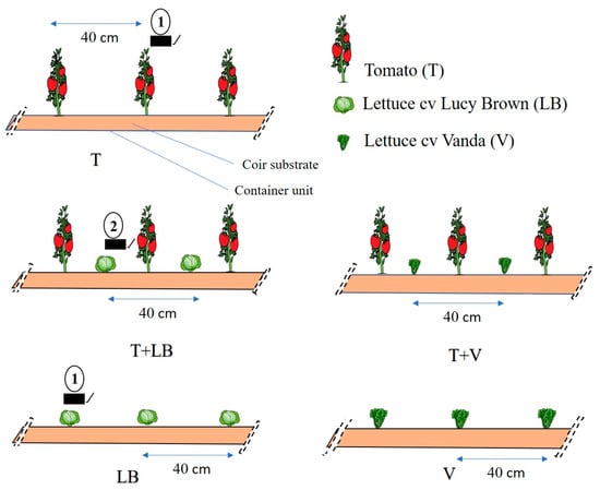 The experiment was an intercropping (I) system of tomato and lettuce vs. monoculture (M) of the two species, grown in a soilless growing system. Treatments were the monoculture of lettuce cv ‘Lucy Brown’ (LB, Crisphead group), lettuce cv ‘Vanda’ (V, loose-leaf group), tomato cv ‘Debora Victory’ (T) and the intercropping of lettuce and tomato (T + LB and T + V) (Figure 1). Each intercrop replicate consisted of twelve tomato plants intercropped with twelve lettuce plants of either cultivar. For monoculture, each replicate had twelve tomato plants or twelve lettuce plants (LB and V), and in intercropping, each replicate had twelve tomato plants and twelve lettuce plants (LB and V). The experimental design was a randomized block design, with five treatments, six blocks and twelve plants per species and replicate, with a total of 72 plants in each monoculture treatment and 144 in intercropping.