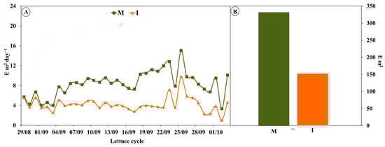 Figure 2A shows the photosynthetically active radiation (PAR) intercepted during the lettuce intercropping cycle. During the first two weeks there was no significant difference between crop systems; however, with the intercropping system, as the tomato plants grew, radiation reaching the lettuce decreased. The total loss of incident radiation on the lettuces in the intercropping system compared to those grown by monoculture was 48.7% (Figure 2B), while Tringovska et al. [14], with the same crops (tomato and lettuce), reported a lower plant growth loss of 27%. In the same intercropping situation, also with tomato and lettuce at a latitude of 32° (Almeria, Spain), Cunha–Chiamolera et al. [45] published a mean PAR value of 8 E m−2 day−1, meaning that 30% of radiation was lost, while in Jaboticabal (Brazil) at a latitude of 21° and a mean radiation of 12 E m−2 day−1, a 50% reduction in PAR was also obtained.