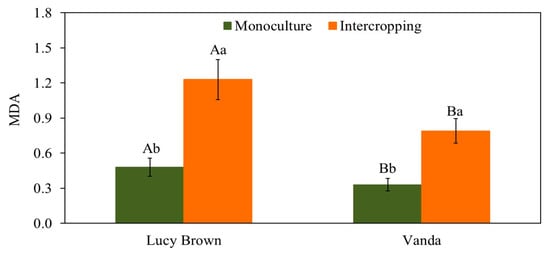 Numerous authors have reported lipid peroxidation, expressed as MDA content, as a good indicator of stress [32,47,48]. Figure 3 shows MDA levels in the two lettuce cvs and cropping systems. The levels for cv Lucy Brown were significantly higher than those for Vanda in monoculture. In addition, in both intercropping systems, MDA levels were higher than for monoculture. An average reduction in radiation of 50% in the intercropping system led to a very significant increase in MDA of 60.9% and 58.2% in cvs Lucy Brown and Vanda, respectively. MDA content is closely related to the antioxidant defense system through the action of enzymes that can eliminate ROS [49,50,51]. The high levels in both lettuces in intercropping show that the plants suffered under low light conditions. Therefore, MDA was a good indicator of potential light stress, as already published by Wang et al. [52] for garlic plants with eggplant intercropping. Our MDA values were similar to those found by Alves et al. [51] working on salt stress in lettuce seedlings of the same cultivars we used.