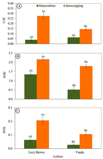 Specific activity of antioxidant enzymes. (A) Catalase (CAT, µmol min−1 mg−1 protein), (B) superoxide dismutase (SOD, U SOD mg−1 protein) and (C) peroxidase (POX, μmol of H2O2 min−1 mg−1 protein) in lettuce plants. Capital and lowercase letters indicate significant differences according to Tukey’s test at 5% (n = 20) probability of cultivars in the same cropping system and in the same cultivar between cropping systems, respectively.