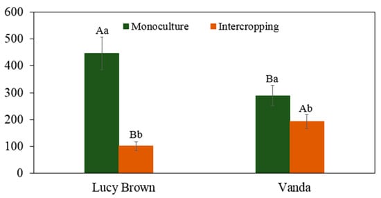 The fresh weight values of Lucy Brown lettuces in monoculture were more than those for Vanda (Figure 5). The decrease in intercropping yield for Lucy Brown (77.2%) was higher than the 50% reduction in average incident radiation, while Vanda’s loss of fresh mass was lower (33.2%). Barros Junior et al. [63] and Barbosa et al. [65] also found a similar trend when working with Lucy Brown and Vanda cvs. This difference in the growth of the cultivars is related to the greater need of light in the Lucy Brown cv compared to the Vanda cv [66]. This loss of yield for lettuce was also recorded by Yan et al. [67], Cecílio Filho et al. [68], Su et al. [69] and Tringovska et al. [14], who used intercropping systems with lettuce and tomatoes.
