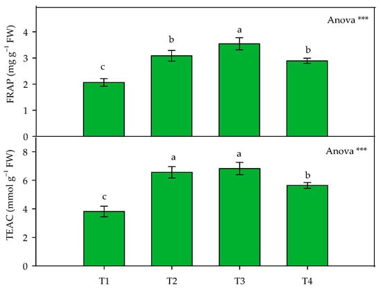 Values of the ferric ion reducing antioxidant potential (FRAP) and Trolox equivalent antioxidant activity (TEAC) tests for pepper plants (Capsicum annuum, cv. Alycum), 7 days after the treatments commenced. T1: Hoagland nutrient solution; T2: 100 mM NaCl in the Hoagland nutrient solution; T3: 100 mM NaCl in the Hoagland nutrient solution with the foliar application of CSL at 5 mL L−1 every 7 days; and T4: 100 mM NaCl in the Hoagland nutrient solution with the root application of CSL at 5 mL L−1 every 7 days. In the ANOVA, the significance level is represented by p < 0.001 (***). The different lowercase letters indicate significant differences (p < 0.05) between the means, as established by Fisher’s least test (LSD). The values indicate the means ± standard deviations (SDs) (n = 8).