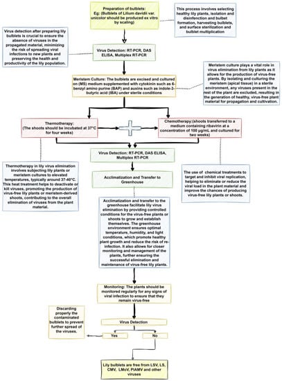 More than 20 species have been identified, as reported in previous research [,]. Research is actively underway to address the spread of lily viruses by developing a standardized protocol for producing virus-free seeds and seedlings. The aim is to establish an economically viable approach for lily plant production []. While it is important to acknowledge the significant progress made in reducing the incidence of major viruses in planting stock through advanced virus detection techniques such as immunoassay and molecular methods, it is essential to recognize that detection alone is insufficient in minimizing the presence of viruses []. To achieve effective virus control, a comprehensive approach encompassing both detection and elimination strategies is required. Therefore, in addition to the advancements in detection methods, efforts are being directed towards the development of reliable and efficient tools for virus elimination in lily plants. By combining these two aspects, researchers aim to establish a holistic management approach that ensures the production of healthy and virus-free lily plants for sustainable cultivation. The objective of this review is to compile and present knowledge on advancements in lily virus management techniques, including elimination and detection methods. The aim is to provide a comprehensive overview of the challenges faced in lily virus management and discuss potential solutions. By highlighting the limitations of current techniques and reviewing the emerging new sophisticated methods, the review seeks to address gaps in scientific knowledge and contribute to the improvement of lily virus management practices.
