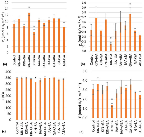 KIN + ABA increased the photosynthetic rate by up to 28% compared to the control (Figure 1a). Furthermore, GA + ABA increased the stomatal conductance by up to 42.2% compared to the control (Figure 1b). Most treatments had no significant effects compared to the control; however, KIN + SA had significant negative effects on the photosynthetic indices. It decreased the photosynthetic rate by up to 38%, the stomatal conductance by up to 2.8 times, the intercellular CO2 by up to 9% and the transpiration by up to 2.2 times compared to the control (Figure 1).