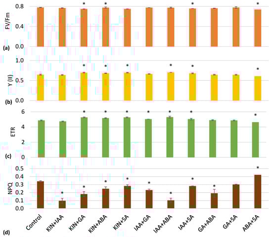 The maximum quantum yield of the PSII photochemistry of the dark reactions (Fv/Fm) was negatively affected by KIN + GA (decreased by up to 4.2%) and KIN + ABA (decreased by up to 4.1%). KIN + GA also increased the Y(II) by up to 3–8% compared with the control. ABA + SA decreased the Fv/Fm by up to 5.7% (Figure 2a) and significantly decreased the Y(II) by up to 6% compared with the control (Figure 2b). With KIN + GA, KIN + ABA and KIN + SA, the same trends were determined for the ETR and Y(II); these treatments increased the ETR by up to 7.7%; 5.5% and 7.7% and the Y(II) by up to 8.2%, 6.1% and 8.2%, respectively (Figure 2c). IAA, together with KIN, GA and ABA, significantly decreased the PS II-regulated heat emission. The NPQ significantly decreased by up to 1.5–3.5 times compared to the control, except for with the ABA + SA treatment (Figure 2d).