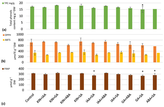 Effects of phytohormones on total phenol content (TPC) (a) and DPPH, ABTS (b) and FRAP (c) radical scavenging activity in lettuce leaves, in dry weight. Values are means ± SEs of five replicates, and * shows significant differences based on the Duncan comparison test (p ≤ 0.05). Control—sprayed water, KIN—kinetin, IAA—indole-3-acetic acid, GA—gibberellic acid, ABA—abscisic acid, and SA—salicylic acid.