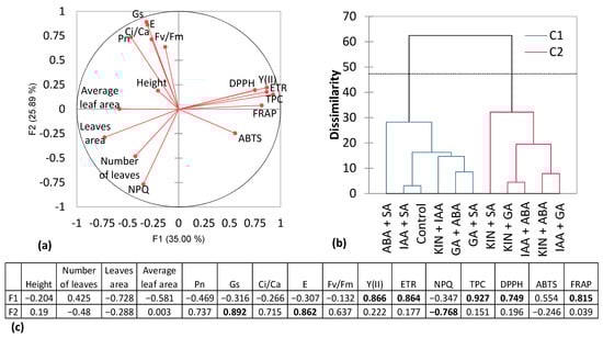 According to the agglomerative hierarchical clustering results, all treatments came down to two main clusters (Figure 4b). Each cluster’s group showed similar phytohormone effects and plant system responses to its use. The main group, together with the control, included ABA, IAA and GA in a mix with SA, as well as KIN + IAA and GA + ABA. In the second group, SA, GA and ABA were in a mix with KIN and ABA, and GA was in a mix with IAA (Figure 4b).