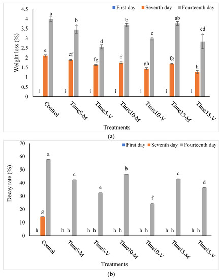 The effect of different treatments indicated that the minimum weight loss (1.36%) was achieved in 15 min US-VP treatment. However, it was not significantly (p < 0.01) different from 5 min US-VP (1.39%) and 10 min US-VP (1.47%) (Table 1). The effect of storage time showed that the minimum weight loss (zero) was obtained on the first day with a significant (p < 0.01) difference compared with the other days (Table 1). The interaction effects of different treatments and storage time showed that the minimum weight loss (zero) was obtained in all the treatments on the first day without a significant (p < 0.01) difference between them (Figure 1a).
