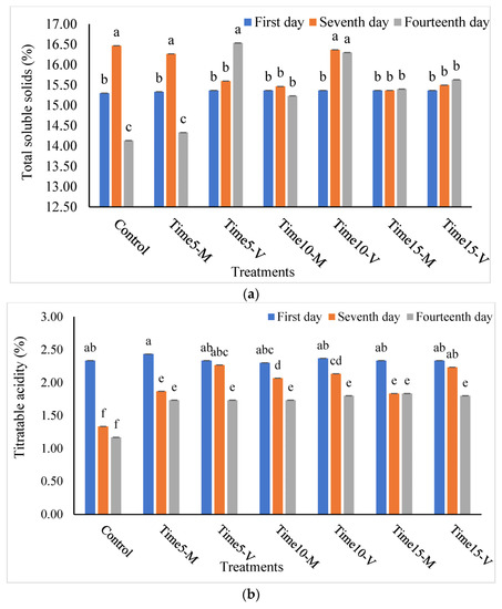 The effect of different treatments showed that the highest TSS was found in 10 and 5 min US-VP with the amount of 16.01% and 15.83%, respectively, which had a significant (p < 0.01) difference compared with the other treatments (Table 3). The effect of storage time indicated that the highest TSS (15.86%) was observed on the seventh day with a significant (p < 0.01) difference compared with the other days (Table 3). The interaction effects of different treatments and storage time showed that the highest TSS was found in the control on the seventh day, 5 min US–passive MAP on the 7th day, 5 min US-VP on the 14th day, 10 min US-VP on the 7th and 14th day (Figure 3a).